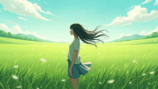 這張圖片展示了一位女孩在綠色的草原上站著。她穿著淺藍色的上衣和米色的短裙,長髮隨風飄動。天空中有白色的雲朵,氣氛清新而寧靜,充滿了大自然的美好。