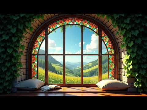 這張圖片展示了一個哥特式拱形窗戶,透過窗戶可以看到美麗的鄉村景色。窗戶由精美的彩色玻璃裝飾,周圍被綠色藤蔓環繞。窗台上擺放著盆栽,地板上有舒適的坐墊和一本打開的書,營造出一個溫馨的閱讀角落。窗外是一片金黃色的田野,遠處有綠色的山丘和藍天白雲,呈現出迷人的自然風光。